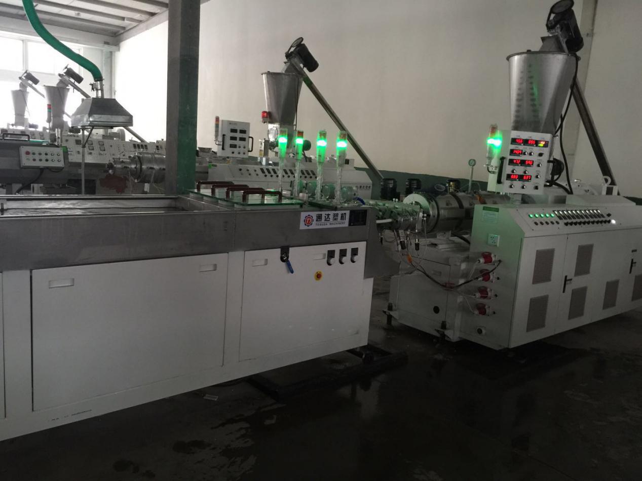 1:SJSZ-65型錐形雙螺桿擠出機,具備高塑化率,熔體均勻,生產(chǎn)連續(xù)、穩(wěn)定;